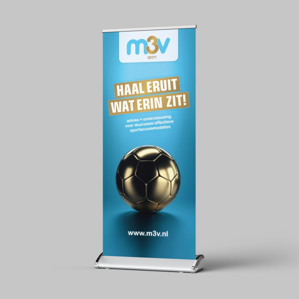 Om goed op te vallen op sportbeurzen verzonnen we bij lekker in vorm een beeldconcept en woordconcept voor M3V sport: een gouden bal met de slogan “Haal eruit wat erin zit!” Verwijzend naar de meerwaarde die huisvesting van sportaccomodaties kan hebben als M3V sport ingeschakeld wordt.