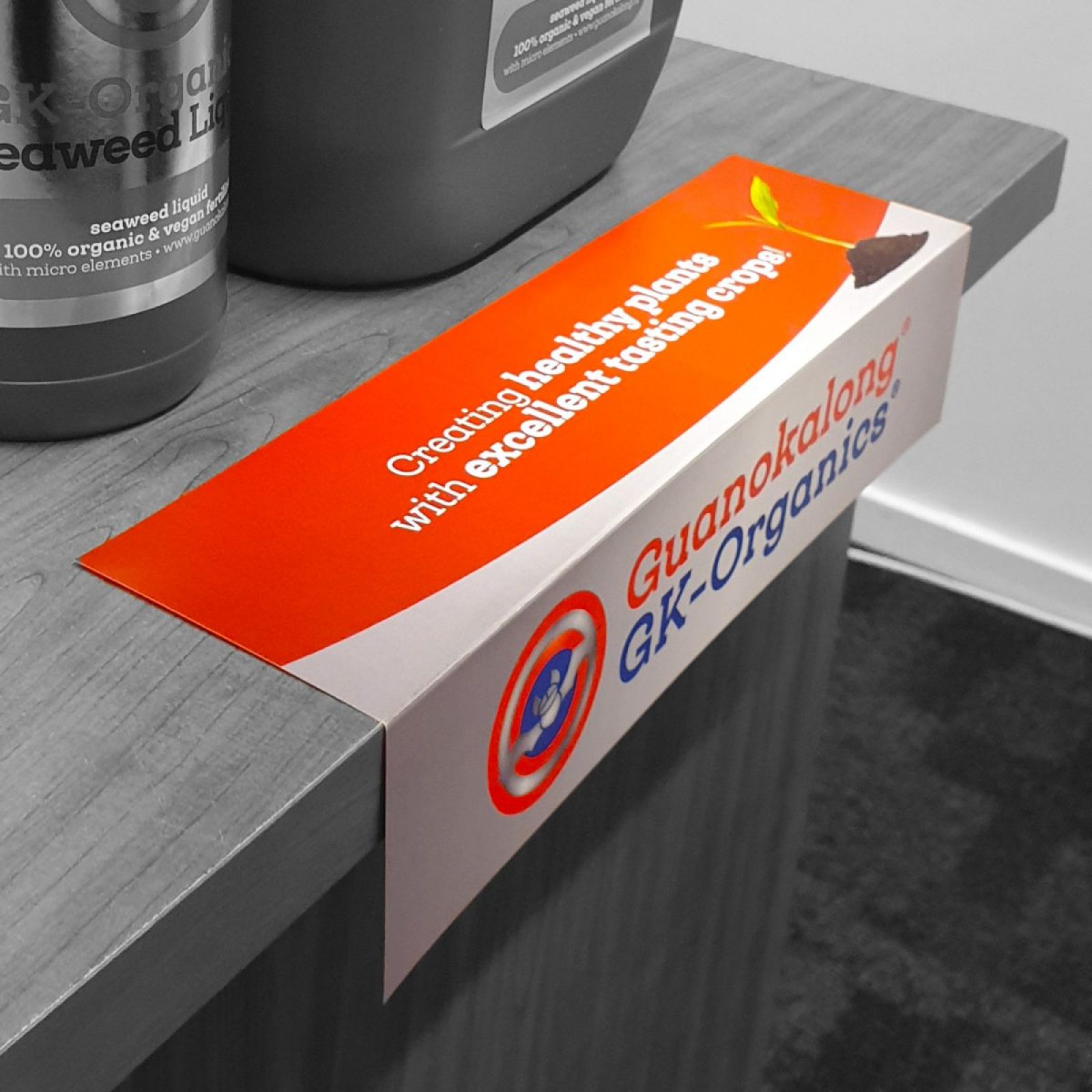 Om de winkelende consument extra te attenderen op de producten van Guanokalong en GK-Organics ontwierpen we bij lekker in vorm deze schapstrook, uitgevoerd in dun kunststof (YUPOBlue®). Extra handig, want deze scheurt niet en is afwasbaar. In combinatie met een wobbler biedt Guanokalong / GK-Organics zo fijne opties voor resellers om hun producten uit te lichten.