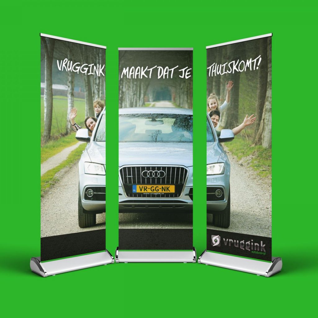 Een mooie aankleding voor de showroom van Autobedrijf Vruggink: dit drieluik op decotex met daarop de nieuwe pay-off. Ook praktisch in te zetten als room divider. Bij de opmaak hebben we bij lekker in vorm al rekening gehouden met de onderlinge afstand van de panelen, zodat de afbeelding optisch fraai doorloopt.