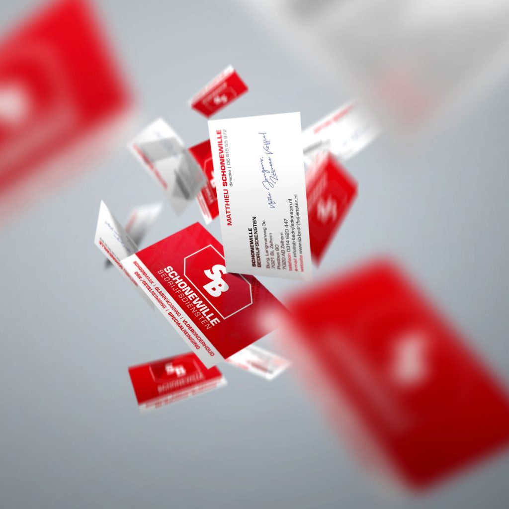 De bestaande visitekaartjes van Schonewille Bedrijfsdiensten worden voortaan voorzien van een pay-off, die nonchalant met de hand lijkt te zijn toegevoegd als persoonlijke noot. De afwerking met spot-UV lak op de voorzijde zorgt nog steeds voor een prachtig effect van natte druppels.