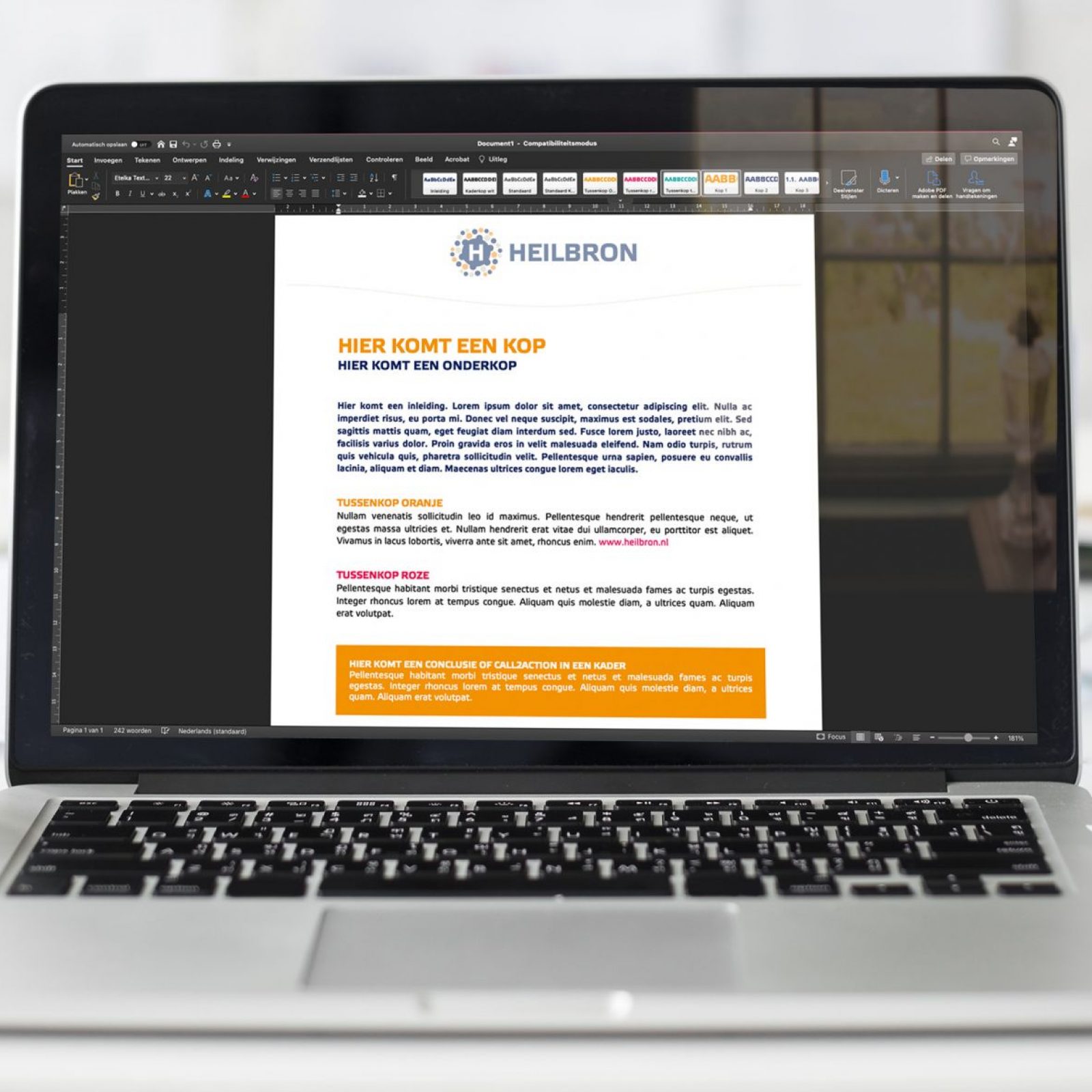 Om de rapporten die de medewerkers van Heilbron zelf in Word maken ook van de eigen huisstijl te kunnen voorzien ontwierp lekker in vorm een Word-sjabloon met vooringestelde titelpagina, tussenpagina’s en alineastijlen op maat.
