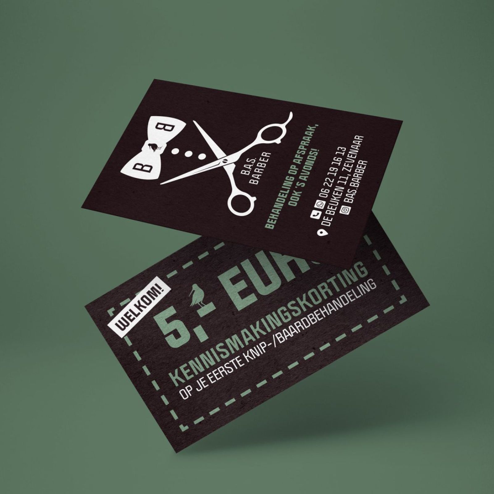Bij lekker in vorm ontwierpen we voor Bas Barber dit visitekaartje, dat tegelijkertijd dienst doet als kortingscoupon voor een eerste kennismaking. Voor extra beleving lieten we het met witte inkt drukken op mat zwart papier.